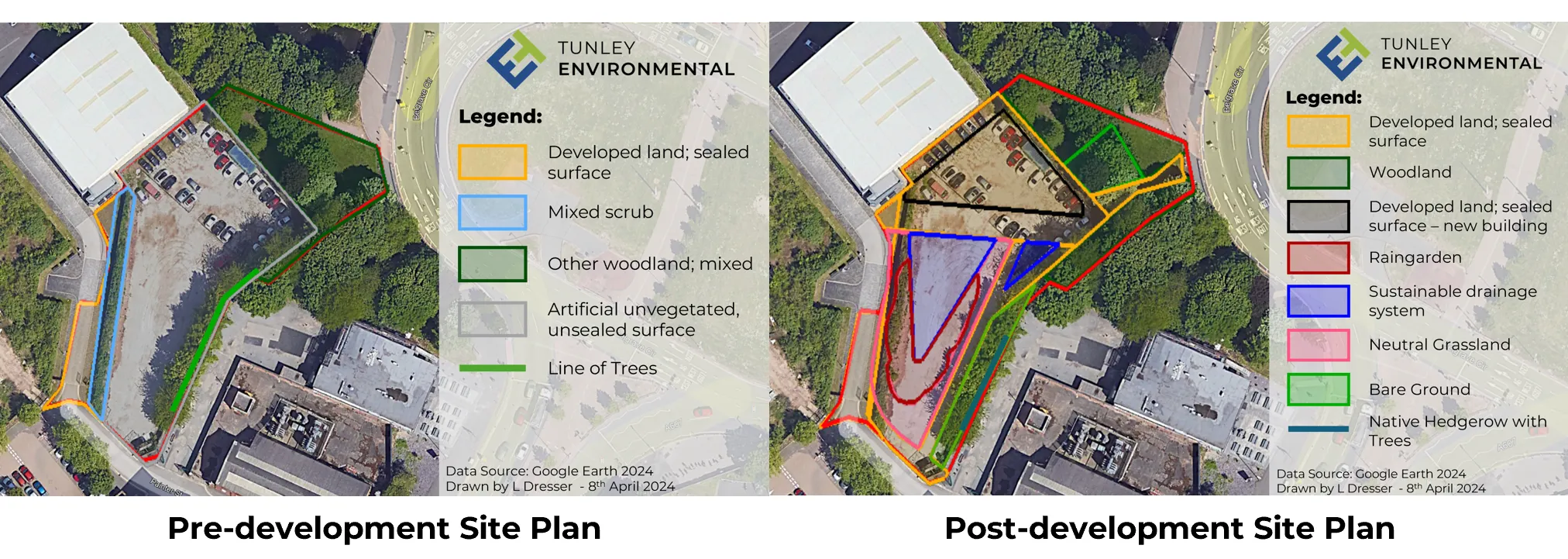 Moss Architecture Interiors Ltd needed to demonstrate a 10% biodiversity enhancement for a new training facility’s planning application. Tunley Environmental executed an independent BNG assessment for the small site, integrating a rain garden, native tree planting, and a neutral grassland mix into the design.