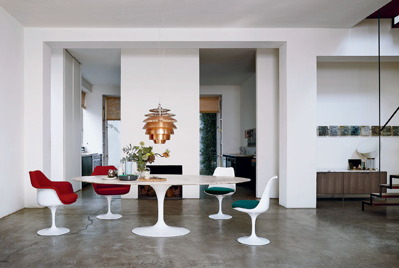 The table features a single-pedestal base designed to resemble paint pouring from a can, made from cast aluminum with a lacquer finish. Its futuristic design remains elegant and timeless, exemplifying Saarinen’s vision.